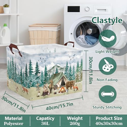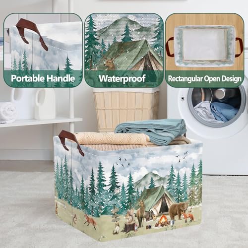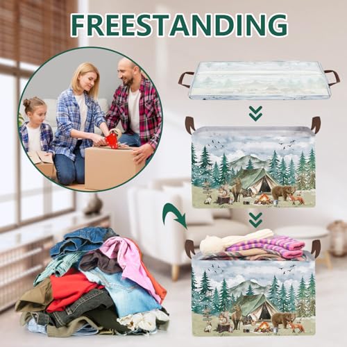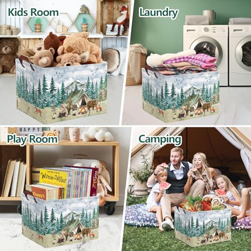 Exquisite Patterns: This woodland animal pattern folding storage basket integrates the wonderful scenery of nature. Multiple exquisite images are printed on the surface, with towering green fir trees and birds soaring freely in the sky. Cute animals such as deer, bears, and foxes gather around tents and campfires as if immersing themselves in a peaceful and beautiful forest camping scene.