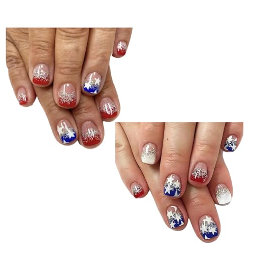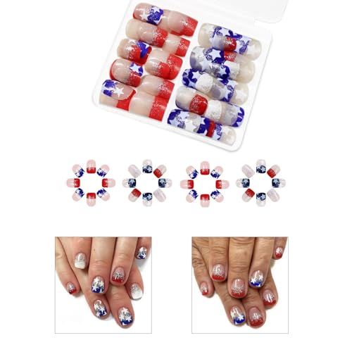 Specification: 4th of July Press on Nails Square French Tip Fake Nails Independence False Nails with Red Blue Glitters Stick on Nails