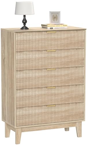 Anmytek 45.7″ Tall 5 Drawers Dresser for Bedroom, Wood Fluted Bedroom Dresser Modern Drawer Chest, 5 Chest of Drawers, Large Wood Storage Dresser Organizer for Bedroom Living Room Nursery Closet