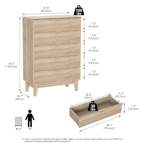 Specification: Anmytek 45.7″ Tall 5 Drawers Dresser for Bedroom, Wood Fluted Bedroom Dresser Modern Drawer Chest, 5 Chest of Drawers, Large Wood Storage Dresser Organizer for Bedroom Living Room Nursery Closet