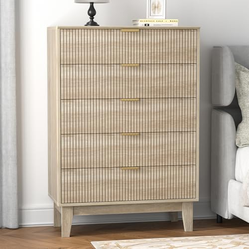 MODERN STYLE: The wood 5 drawers dressers is fabricated through a special technology, the fluted waveform panel with a sleek curved profile design is unique and elegant. Complete with metal handles, the smooth metal guide rail allows the drawer to be pulled out and closed easily and silently. It provides the drawers with durability to last for a long time.