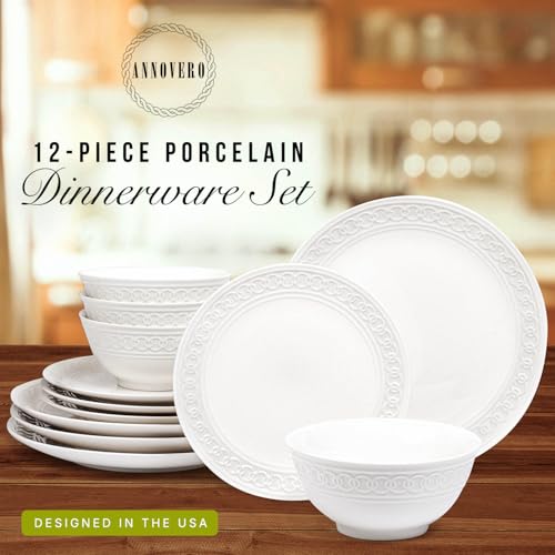 Annovero Plates and Bowls Sets – Dishes Set for 4 – Microwave Safe – 12 Piece Porcelain Dinnerware for Kitchen – Includes 4 Dinner & 4 Appetizer Plates, 4 Cereal Bowls – Zero Lead & Cadmium
