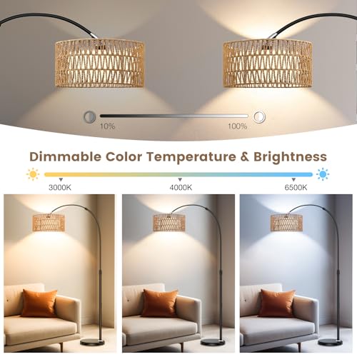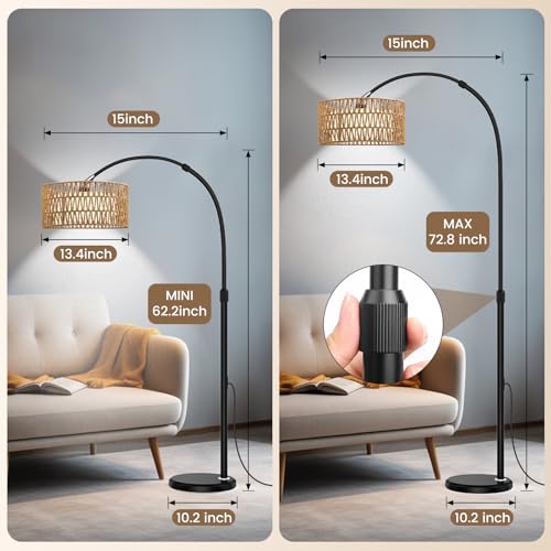 Specification: Arc Floor Lamp with Remote, Modern LED Floor Lamp with Dimmable Bulb, Farmhouse Standing lamp with Fabric & Rattan Lampshades, Height Adjustable Black Tall Lamp for Living Room Bedroom