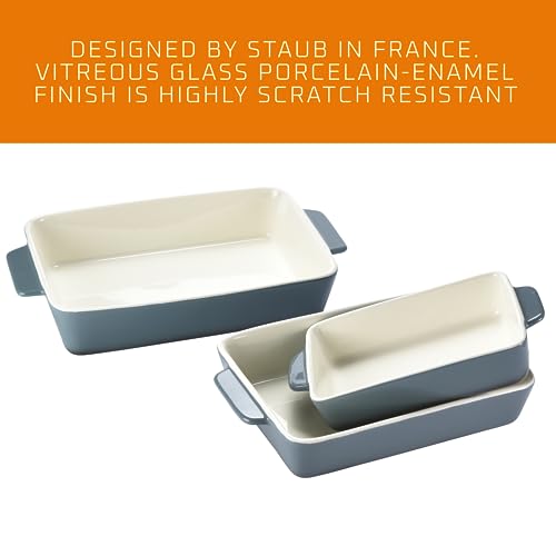 Scratch-Resistant Design: Vitreous glass porcelain-enamel finish of these baking dishes resist scratches; to preserve quality, avoid sharp utensils and clean with a soft cloth