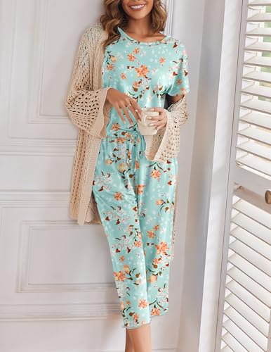 Ekouaer Women’s Capri Pajama Sets Floral Print Short Sleeve Sleepwear Top and Capri Pants 2 Piece Loungewear with Pockets