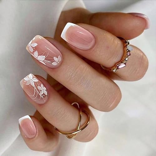 Elevating your styles with our 24Pcs French Tip Square Floral Press On Nails, easy application, offering luxurious and sophisticated manicure look.