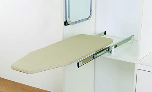 Tucks away into a Drawer! Folding Ironing Board fits right into a drawer! Here’s the perfect answer where space is at a premium. This ingenious mechanism unfolds and pops-up a full ironing board just by opening the drawer. In addition, a special board for ironing sleeves is readily accessible by simply flipping back the top board. Features: Convenient and space saving Ingenious mechanism pops-up and unfolds into full ironing board Optional sleeve board available Durable metal construction Anti-heat reflective covering on all ironing surfaces. After folding into the closet, the length of the ironing board is about 17 inches, width 14 inches, height 5.5 inches Designed with the space conscious person in mind, our Pull Out Ironing Board is another simple storage solution to save space and reduce clutter. Built to be installed easily into a cabinet or closet drawer, simply pull out the drawer when you need it, fold it down, and put it back when you are done. Easy to Install,8 screws fitted inside. Please note, this must be installed into a cabinet or on a shelf shelf (minimum 16.25 deep) and is not meant to be used free standing.
