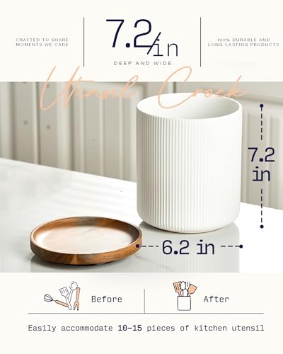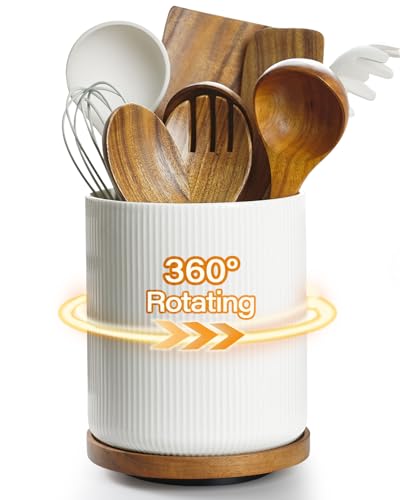 Specification: getstar 360 Rotating Large Kitchen Utensil Holder, Ceramic Cooking Utensil Holder for Kitchen Counter with Rotatable and Detachable Wooden Base