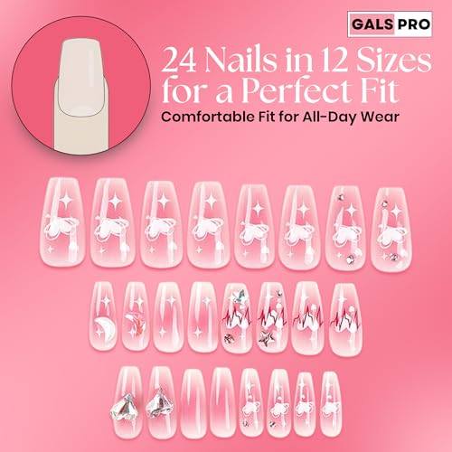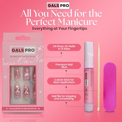 Medium Press on Nails – Set of 24 Fake Nails with Designs in 12 Different Sizes for Perfect Fit, Cute False Nails Kit for Women with 0.07oz Nail Glue (PINKSTARFLY COFFIN SHAPE, Medium)