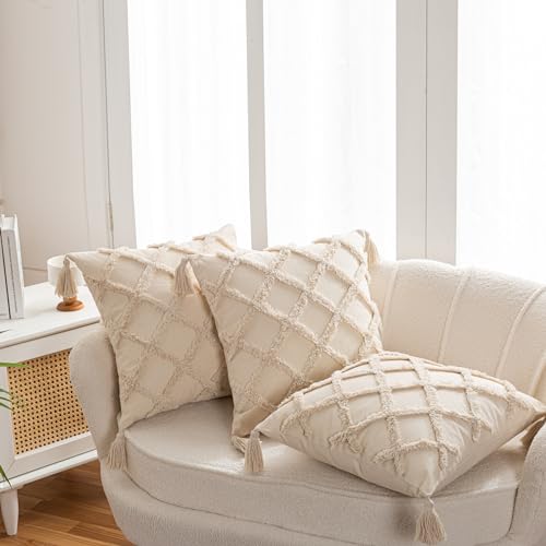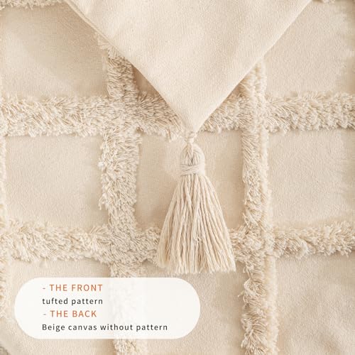 Set of 2 Boho Throw Pillow Covers, 18×18 inch Farmhouse Decorative Pillow Cover with Tassels, Square Soft Plush Cushion Pillowcase for Living Room Sofa RV Bedroom, Beige